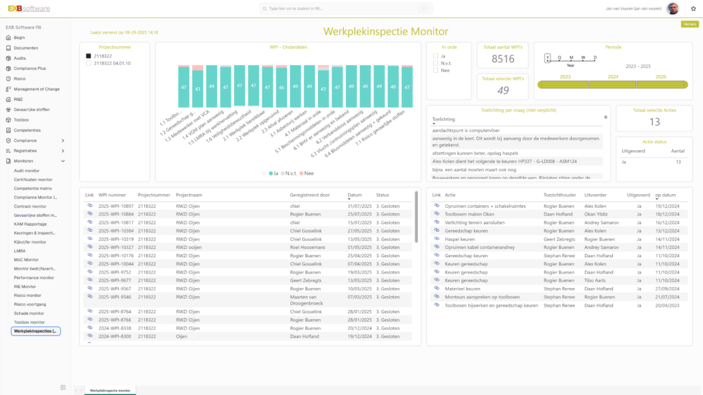 EXB Software ondersteunt de volledige veiligheidsaanpak: van inrichting en uitvoering tot evaluatie en verbetering. Door workflows, taken en automatische reminders weet je zeker dat opvolging plaatsvindt. Certificeringen, keuringen en onderhoudsmomenten verlopen niet ongemerkt, maar worden tijdig gesignaleerd.
